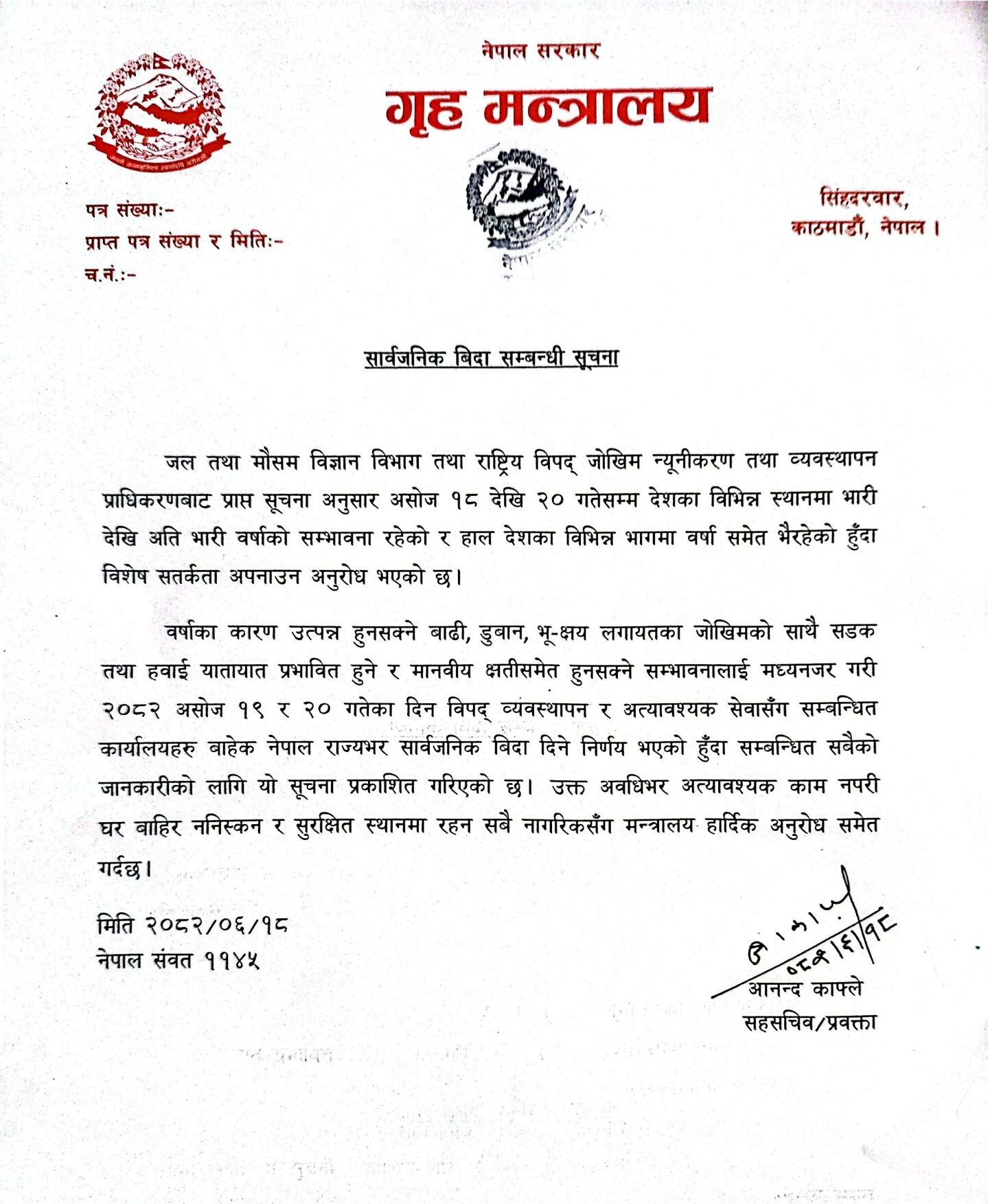 सूचनामा भनिएको छ, “विपद् व्यवस्थापन र अत्यावश्यक सेवासँग सम्बन्धित कार्यालयहरू बाहेक नेपालभरका सबै कार्यालय, संस्था र निकायमा असोज १९ र २० गतेका दिन सार्वजनिक बिदा रहनेछ।” गृह मन्त्रालयका सहसचिव तथा प्रवक्ता आनन्द काफ्लेले हस्ताक्षर गरेको सूचनामा सरकारले नागरिकलाई अत्यावश्यक कामबाहेक घर बाहिर ननिस्कन, सुरक्षित स्थानमा बस्न र सरकारी निर्देशन तथा सूचना पालना गर्न आग्रह गरेको छ।