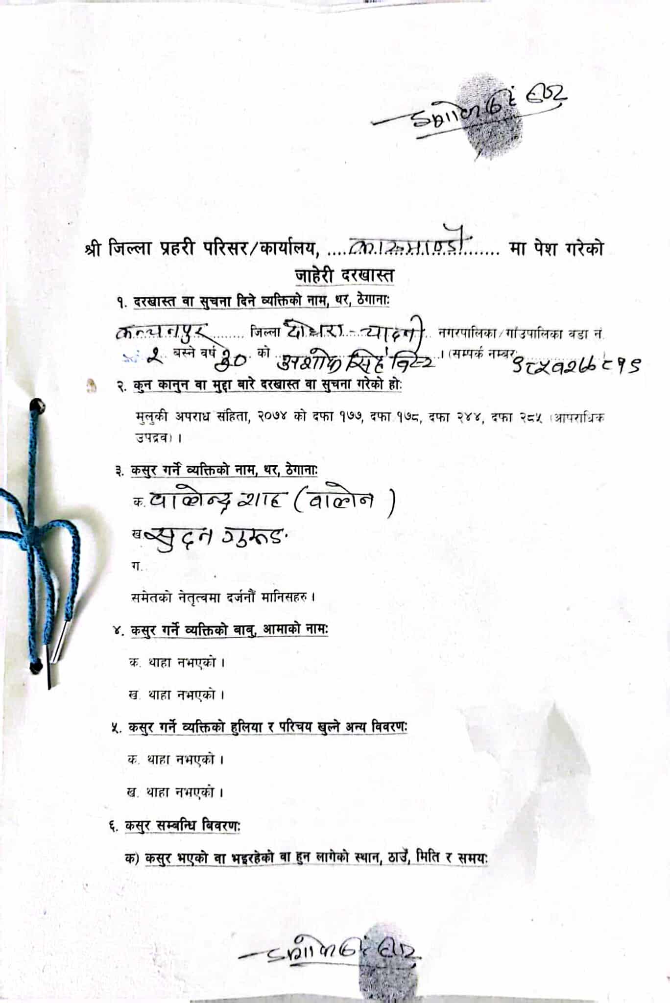 विष्टद्वारा काठमाडौं प्रहरी परिसरमा दर्ता गराइएको जाहेरीमा बालेन र सुधनले युवा विद्यार्थीहरूलाई उक्साएर सर्वसाधारणको ज्यान जाने गरी मुठभेड गराएको, साथै राष्ट्रिय सम्पदा, भवन, सरकारी सामान र कागजात लुटपाट गरी चल–अचल सम्पत्ति नष्ट गर्न उक्साएको आरोप लगाइएको छ।