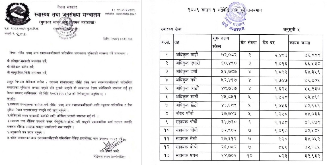 त्यसअनुसार नर्सहरूको न्यूनतम पारिश्रमिक पाँचौं तहमा रु. ३४ हजार ७३०, र वरिष्ठ पाँचौं तहमा रु. ३७ हजार ७४३ तोकिएको छ। तर, युनिभर्सल अस्पतालले नर्सहरूलाई मात्र १३ देखि १५ हजार रुपैयाँसम्म बेसिक तलब दिने गरेको उनीहरूको आरोप छ।