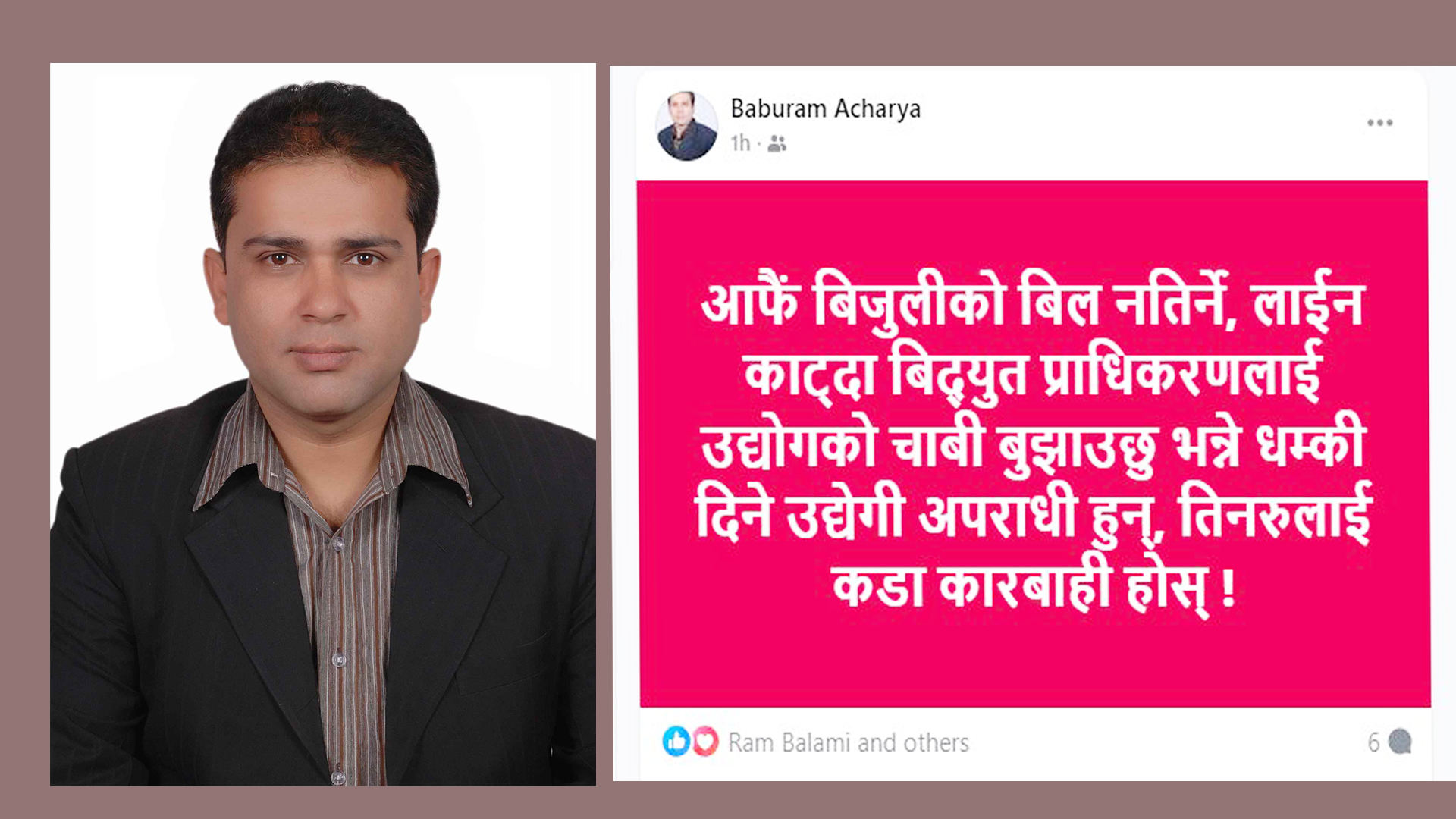 सर्वसाधारणले सानो रकमको बिल नतिरे घरको लाइन नै काटेर अँध्यारो हुने तर ठुला कम्पनीहरूले शक्तिको आडमा बिजुलीको बिल नतिरेको आरोप सर्बसाधारणबाट लागेको बेला सरकारको यस विषयमा समर्थन गर्दै नेता आचार्यले त्यस्ता बिजुलीको बिल तिर्न आनाकानी गर्दै उल्टै धम्की दिनेलाई सामाजिक सञ्जाल फेसबुकमा लेख्दै तिनिहरुलाई कडा कारबाही होस् ! भनेका छन् ।