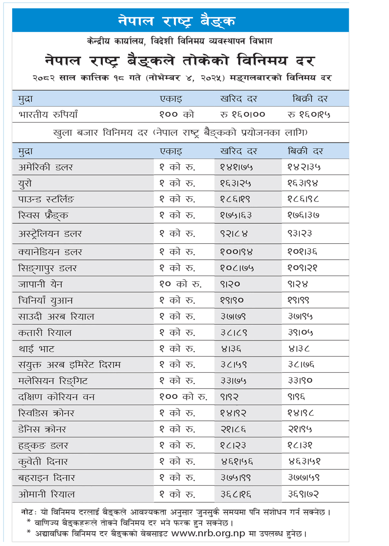 केन्द्रीय बैंकका अनुसार थाइ भाट एकको खरिददर चार रुपैयाँ ३६ पैसा र बिक्रीदर चार रुपैयाँ ३८ पैसा, युएई दिराम एकको खरिददर ३८ रुपैयाँ ५९ पैसा र बिक्रीदर ३८ रुपैयाँ ७६ पैसा, मलेसियन रिङ्गेट एकको खरिददर ३३ रुपैयाँ ७५ पैसा र बिक्रीदर ३३ रुपैयाँ ९० पैसा, साउथ कोरियन वन १०० को खरिददर नौ रुपैयाँ ९२ पैसा र बिक्रीदर नौ रुपैयाँ ९६ पैसा, स्वीडिस क्रोनर एकको खरिददर १४ रुपैयाँ ९२ पैसा र बिक्रीदर १४ रुपैयाँ ९८ पैसा र डेनिस क्रोनर एकको खरिददर २१ रुपैयाँ ८६ पैसा र बिक्रीदर २१ रुपैयाँ ९५ पैसा तोकिएको छ ।