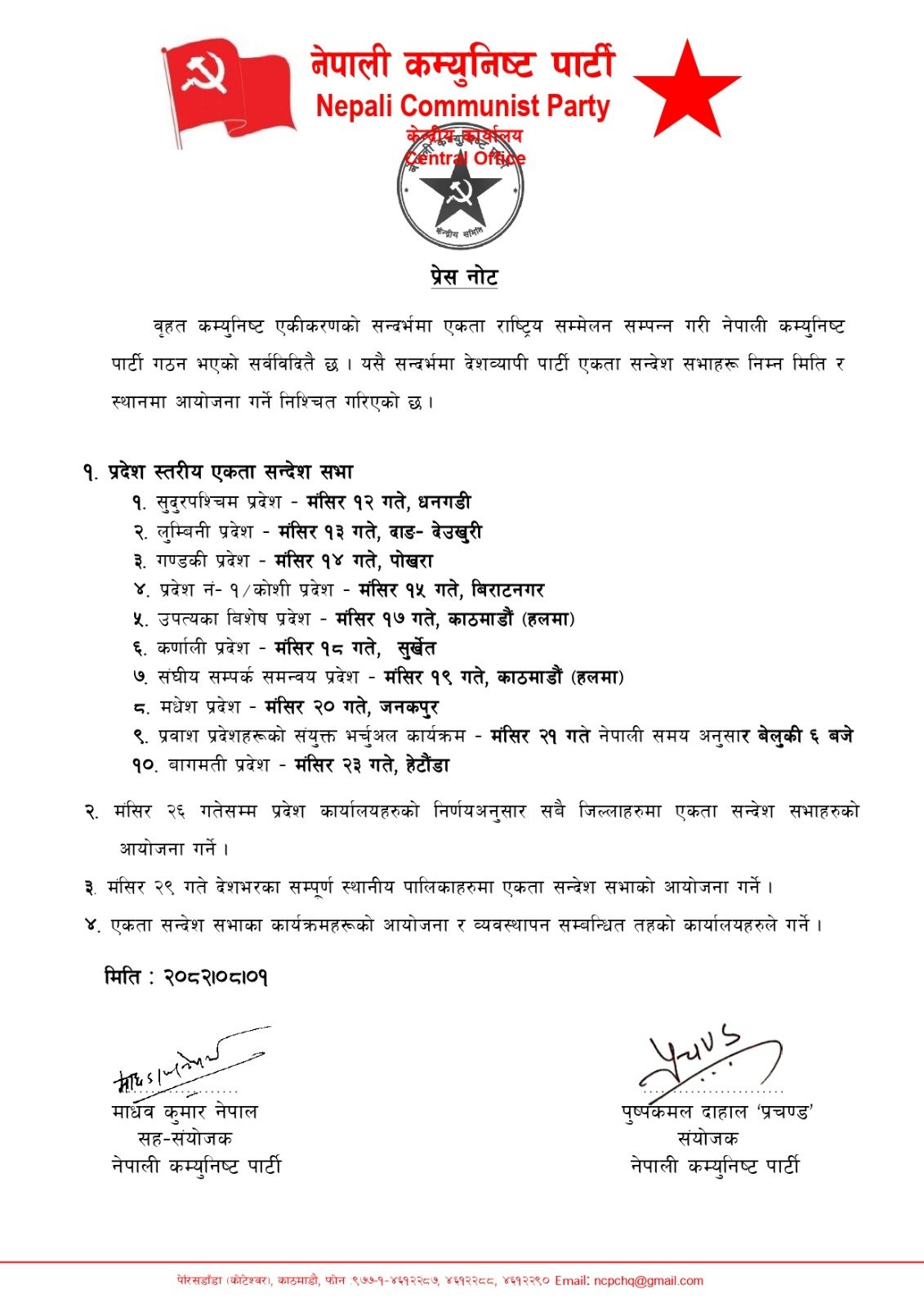पार्टीका संयोजक पुष्पकमल दाहाल ‘प्रचण्ड’ र सह–संयोजक माधवकुमार नेपालले संयुक्त रूपमा जारी गरेको प्रेस नोटअनुसार, प्रदेशस्तरीय एकता सन्देश सभाहरू मंसिर १२ गतेदेखि २३ गतेसम्म देशका विभिन्न स्थानमा सञ्चालन हुनेछन्।