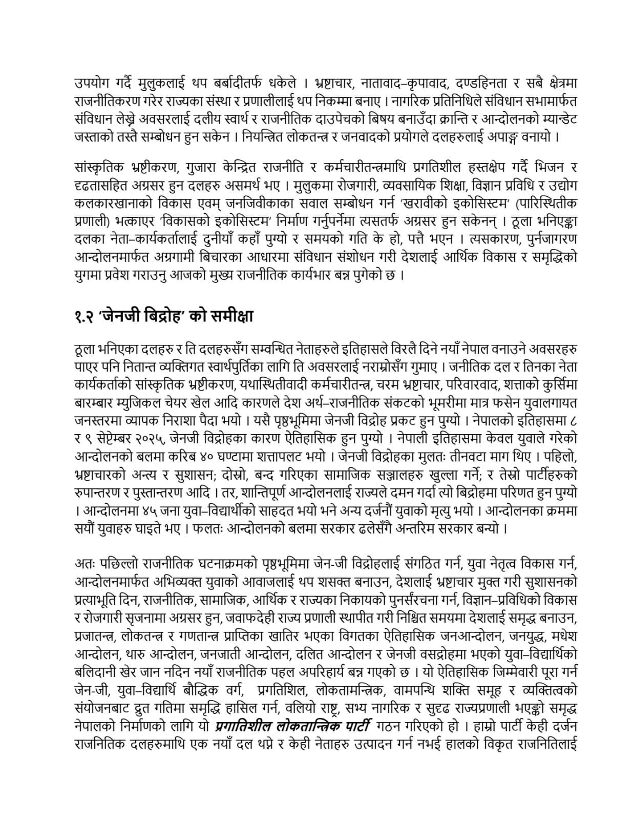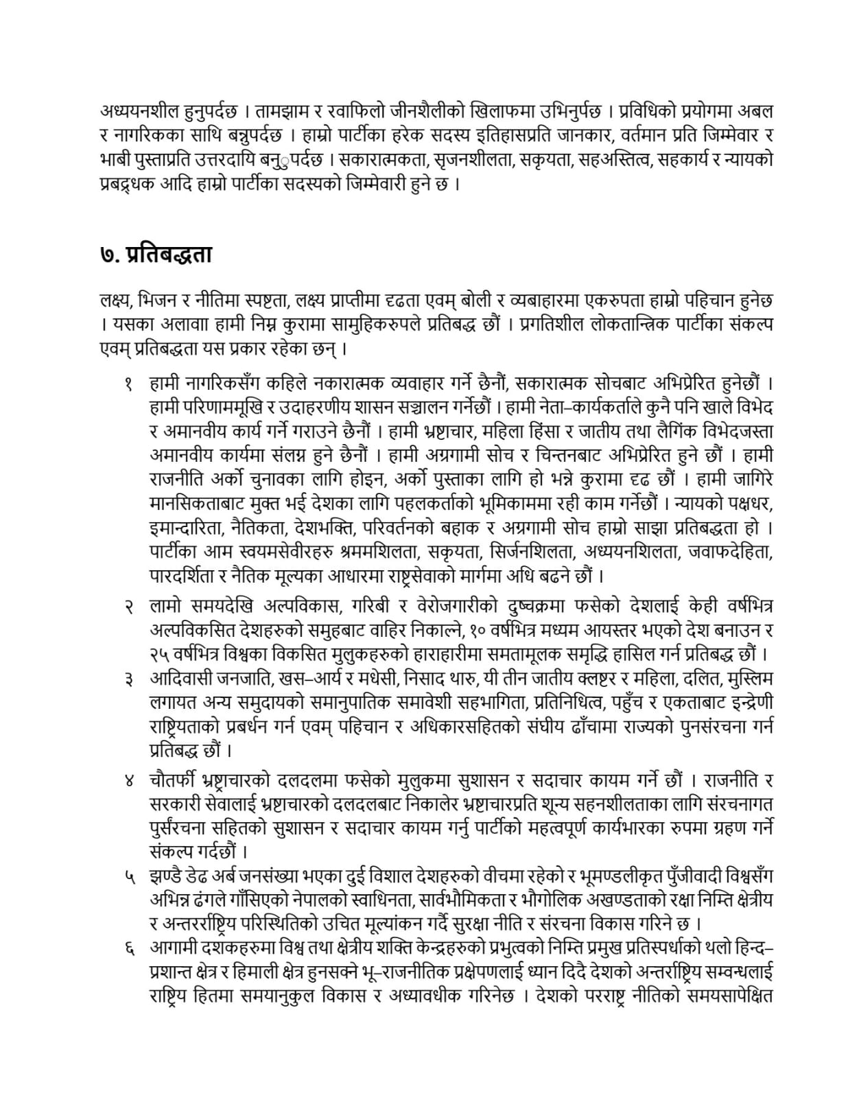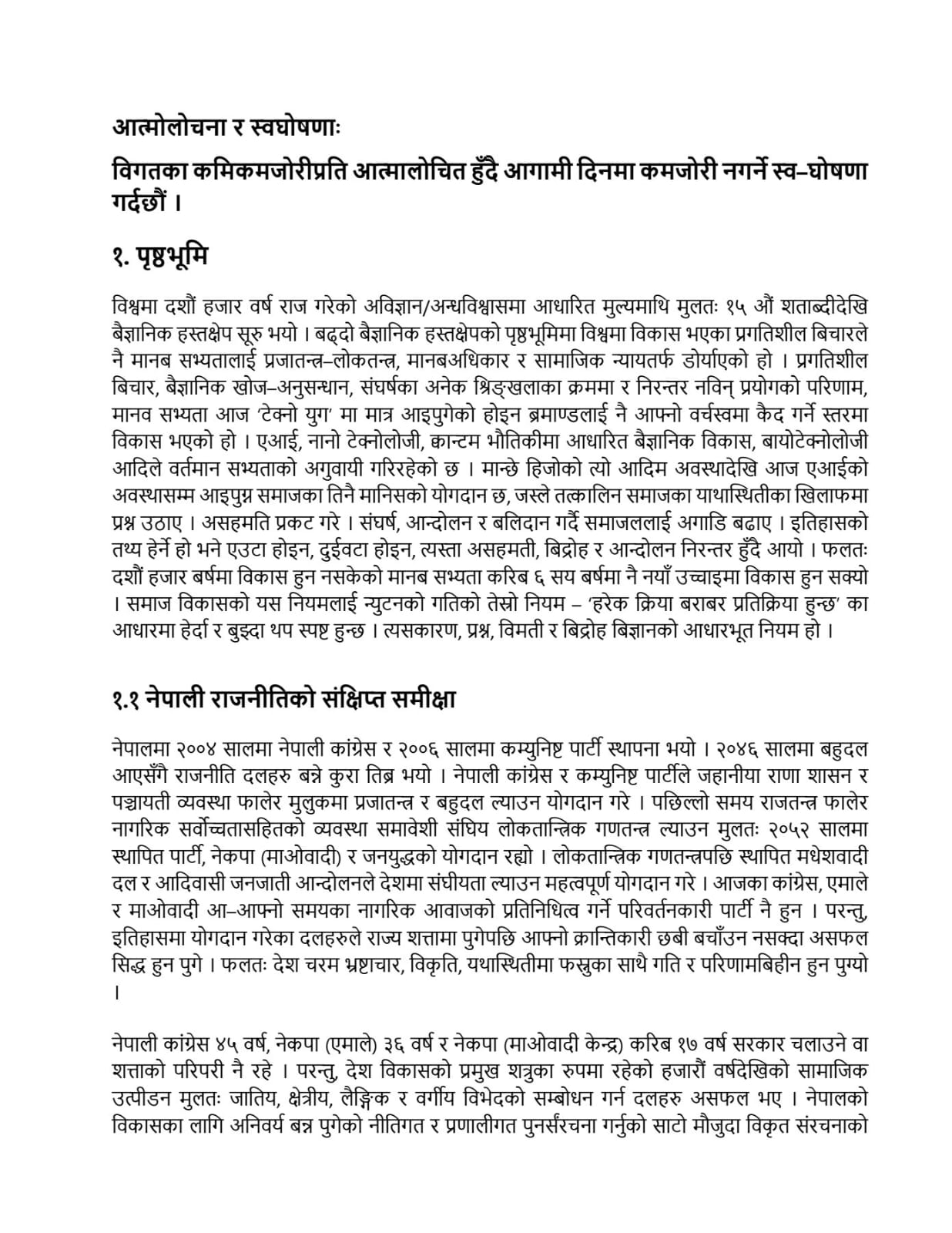 ‘नेपाली माटो हाम्रो बाटो’ नारा बोकेको पार्टीले सुरुमै आत्मालोचना र स्वघोषणा गरेको छ । ‘विगतका कमीकमजोरीप्रति आत्मालोचित हुँदै आगामी दिनमा कमजोरी नगर्ने स्वघोषणा गर्दछौँ’, प्रतिबद्धतामा भनिएको ।