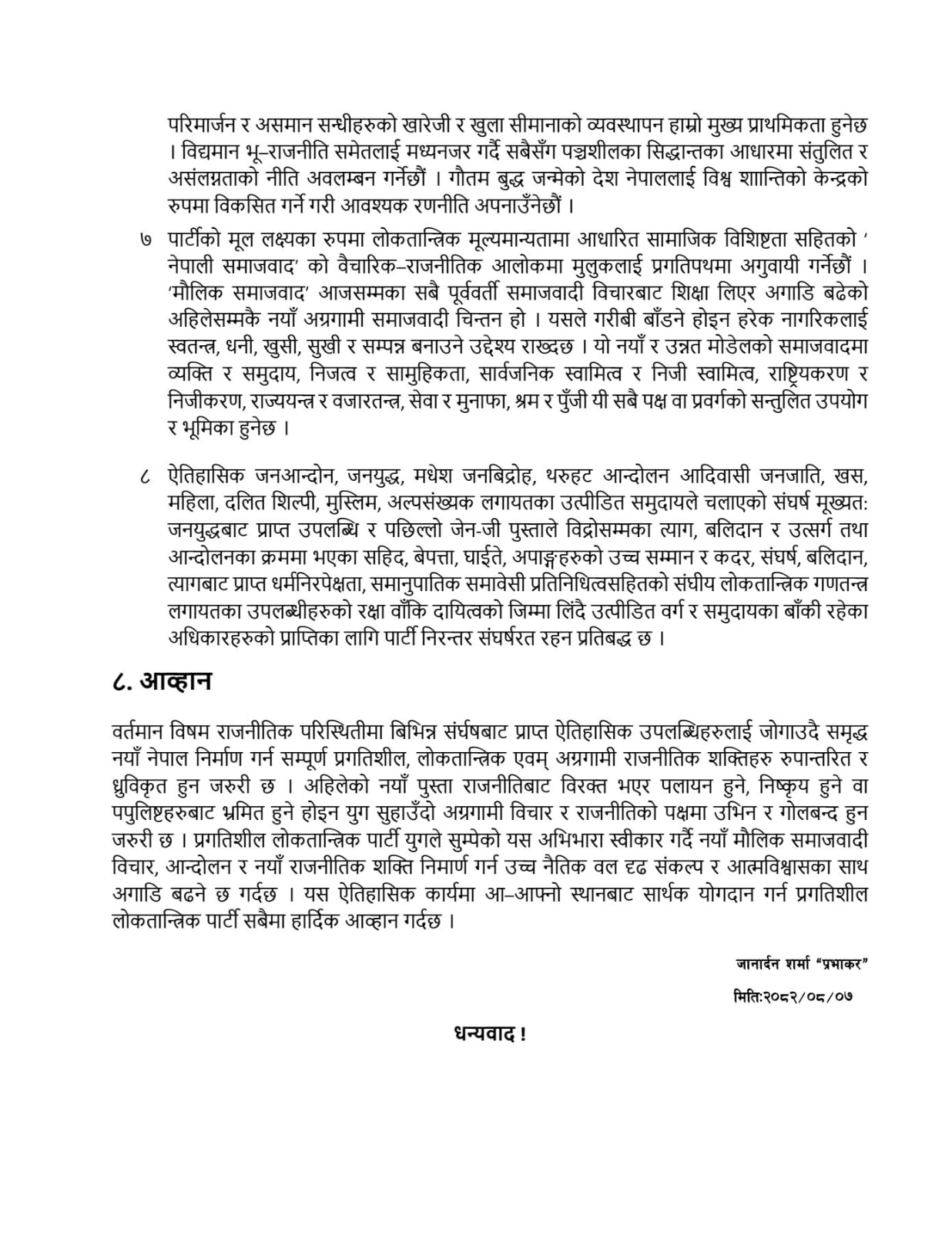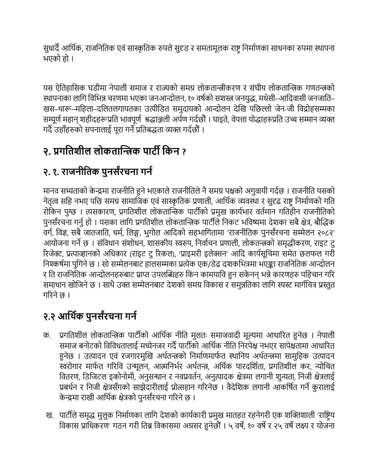 प्रगतिशील समाजवाद मार्गदर्शक सिद्धान्त सो पार्टीको रहेको र त्यसको चुनाव चिन्ह आँखा राखिएको छ । पार्टीले आफ्नो संक्षिप्त राजनीतिक प्रतिबद्धता सार्वजनिक गरेको छ । पार्टी घोषणा कार्यक्रममा नेता जनार्दन शर्माले पार्टीको संक्षिप्त प्रतिबद्धता सार्वजनिक गरेका हुन् ।