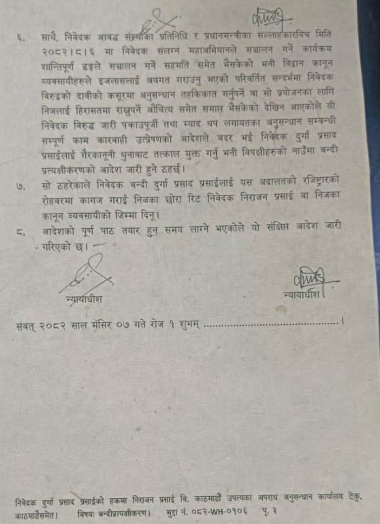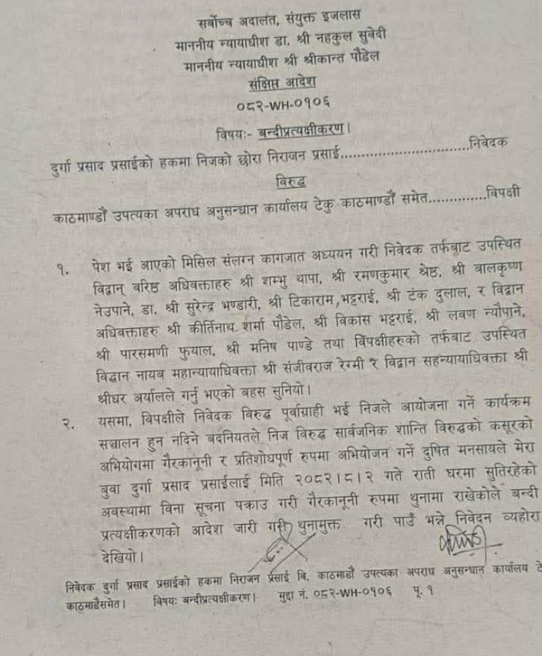 काठमाडाैँ । मेडिकल व्यवसायी दुर्गा प्रसाईलाई थुनामुक्त गर्न सर्वोच्च अदालतले आदेश दिएकाे छ । आइतबार डा‌. नहकुल सुवेदी र श्रीकान्त पाैडेलकाे संयुक्त इजलासले प्रसाईँलाई थुनामुक्त गर्न आदेश दिएकाे हाे ।