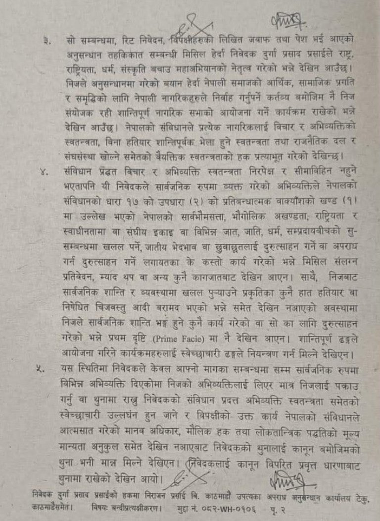 अभिव्यक्तिलाई लिएर मात्र प्रसाईँलाई पक्राउ गरिनु संविधान प्रदत्त अभिव्यक्ति स्वतन्त्रता समेतको स्वेच्छाचारी उल्लङ्घन हुने अदालतको आदेशमा भनिएको छ ।