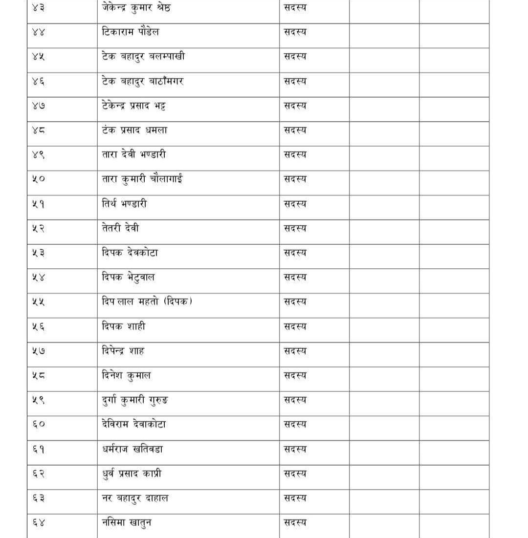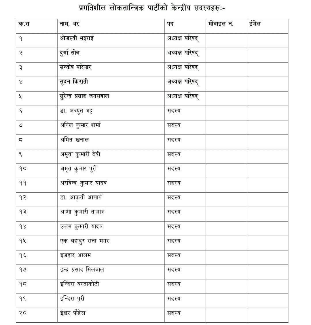बाँकी सबैलाई केन्द्रीय कमिटी सदस्य तोकिएको सो पार्टीले सोमबार जनाएको छ । मंसिर ७ गते प्रगतिशील लोकतान्त्रिक पार्टीको घोषणा भएको थियो । उक्त पार्टीको केन्द्रीय कमिटीमा संरक्षाक समेत रहेका पूर्वमन्त्री जनार्दन शर्माको पनि नाम छ ।